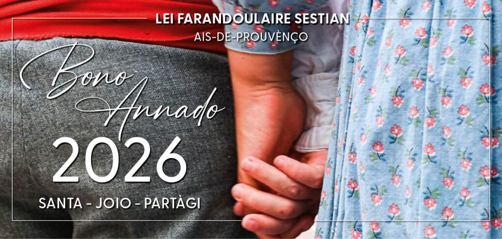 Bono Annado 2026par moussu_f1 janvier 20269 janvier 2026 Bonno Annado 2026 LEI FARANDOULAIRE SESTIAN vous souvèton uno bono annado 2026 !Santa, Joio e Partàgi ! précédentPastorale Maurel d’AixsuivantBalèti de la Chandeleur 2026
