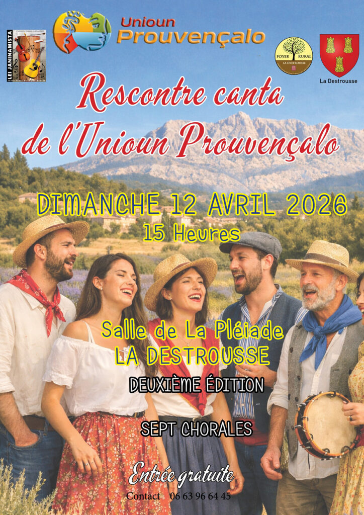 Dimanche 12 avril 2026, 12 chanteurs de la chorale de notre association la “Cantarello Sestiano” participeront à une rencontre de chorales provençales organisée pour la deuxième fois par l’Unioun Prouvençalo à la Destrousse.