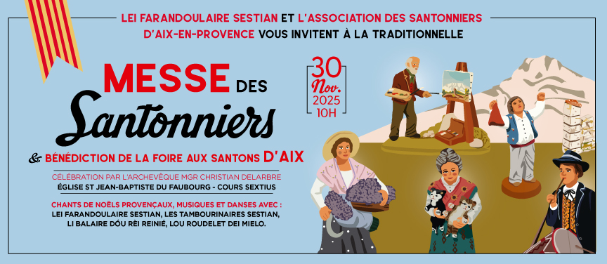 Cette messe unique est célébrée en langue provençale et accompagnée de chants et musiques traditionnels de Noël, interprétés par notre chorale la Cantarello Sestiano et les tambourinaires des groupes folkloriques d’Aix. Elle met à l’honneur la culture, la foi et le savoir-faire des santonniers d’Aix-en-Provence, véritables artisans du patrimoine provençal.