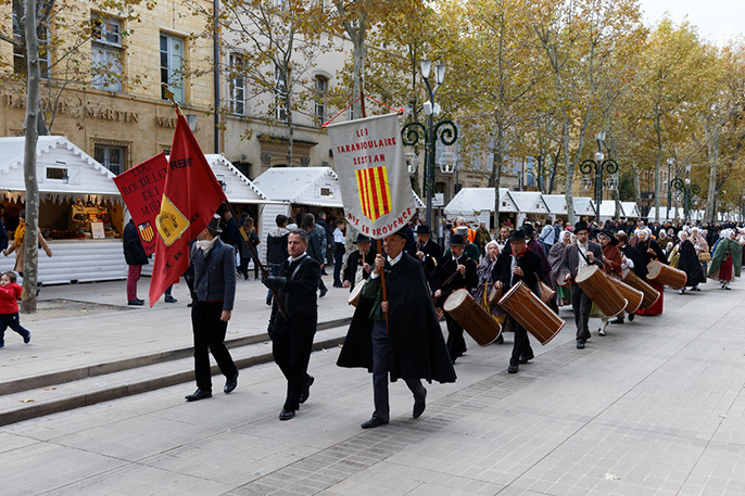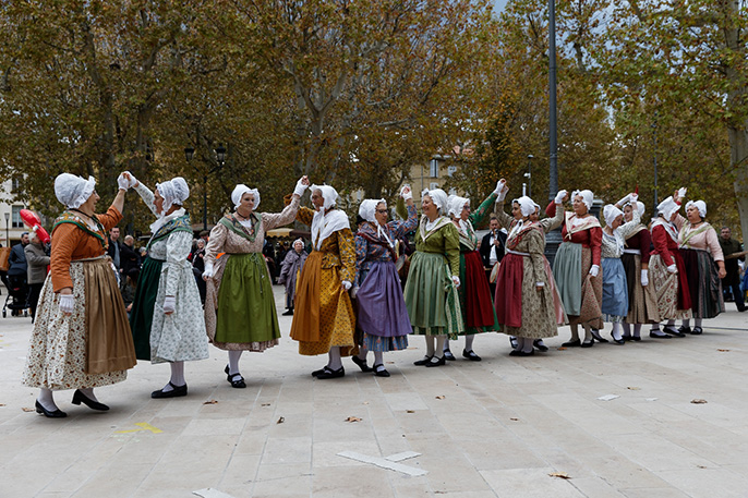 À partir de 11h00, un “passo-carriero” (défilé provençal dans les rues d’Aix) conduit les participants et les groupes folkloriques jusqu’à l’Esplanade Cézanne, située devant l’Office du Tourisme. C’est là que se tient l’inauguration officielle de la Foire aux Santons d’Aix-en-Provence, suivie de la bénédiction des santons.